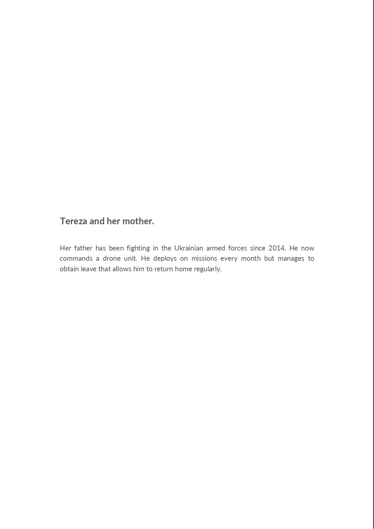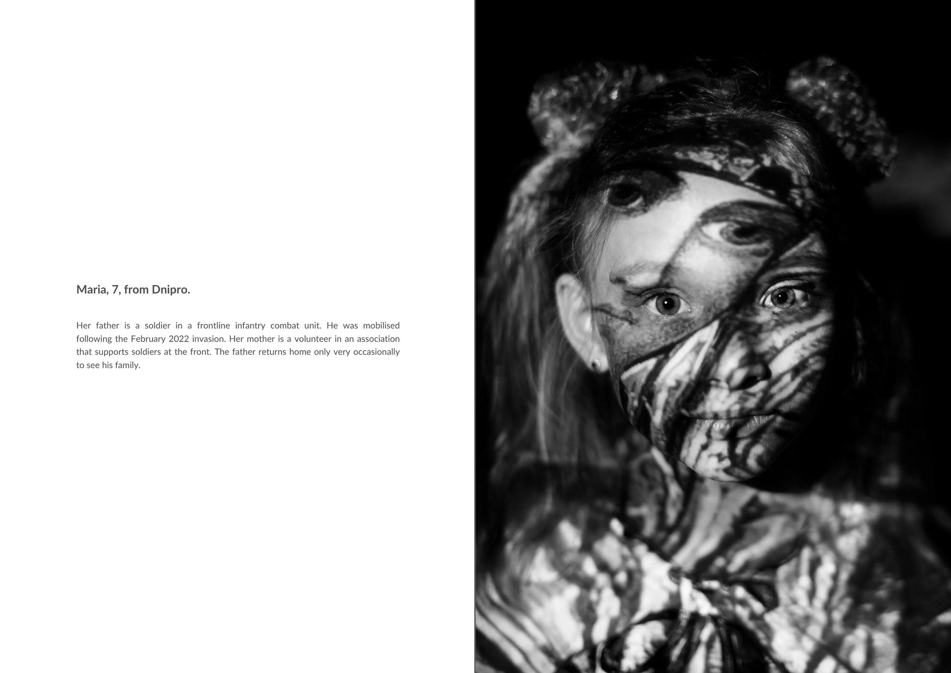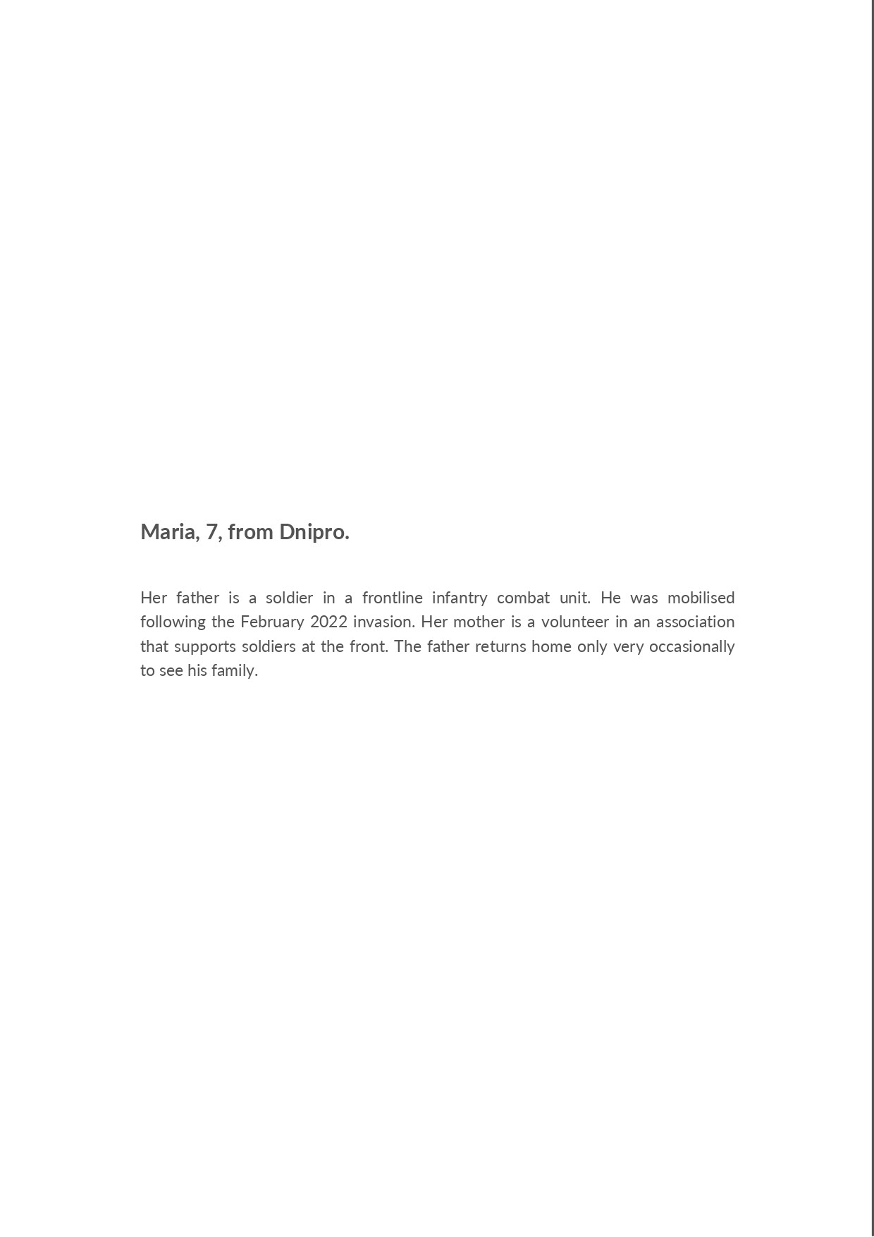 Maryna from Dnipro. Her father is a soldier in an infantry combat unit. He was mobilized after the February 2022 invasion. Her mother volunteers with an organization that helps frontline soldiers. The father only rarely returns to see his family.