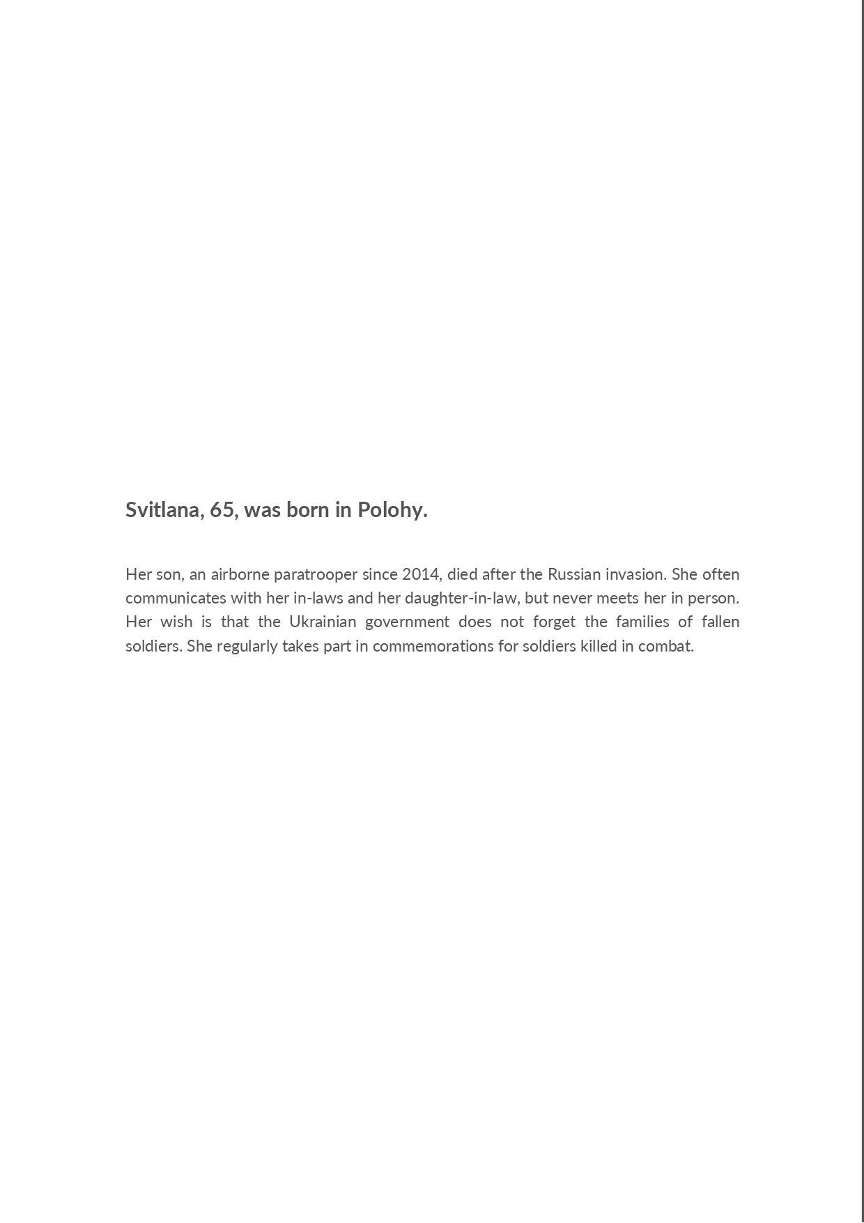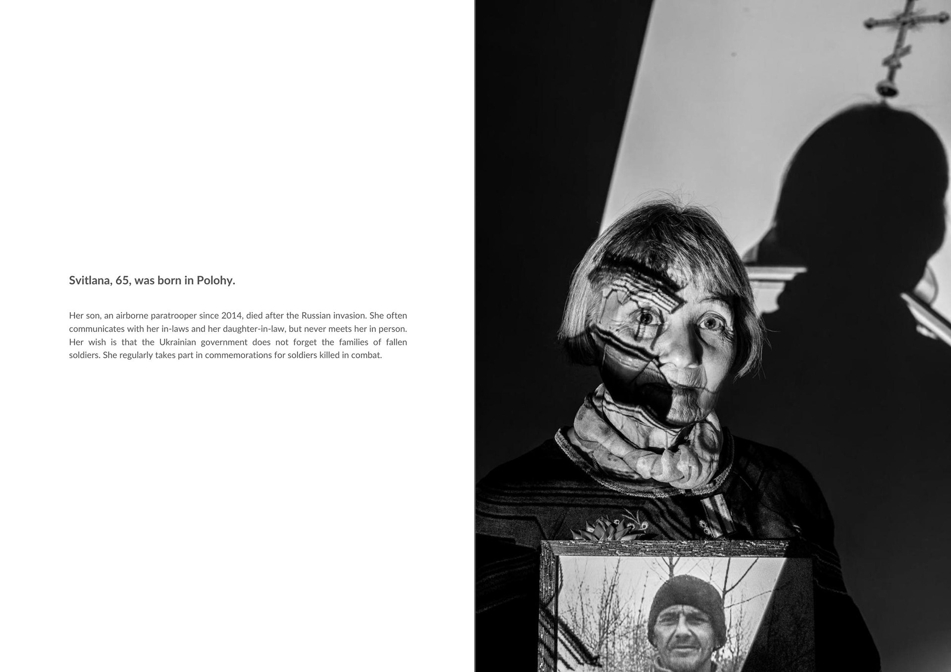 Svitlana, 65, was born in Polohy. Her son, a paratrooper in 2014, died after the Russian invasion. She often communicates with her in-laws but never meets them. Her dream is that the Ukrainian government won’t forget the families of soldiers. She regularly takes part in commemorations for fallen soldiers.