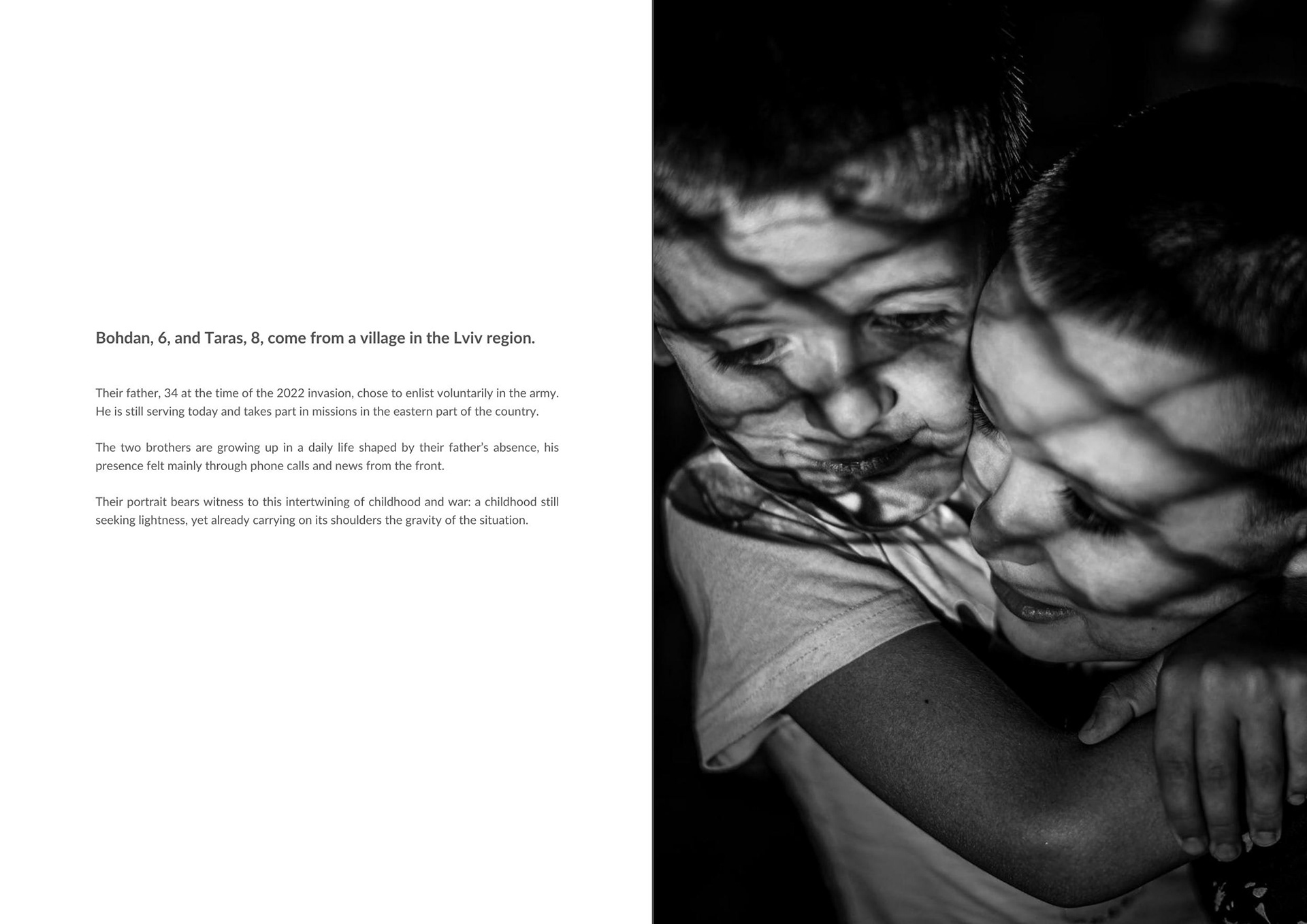 Bohdan, 6, and Taras, 8, are from Zymna Voda, a village in the Lviv region. In February 2022, their 34-year-old father decided to enlist in the army. He is still serving and takes part in missions in the east of the country.