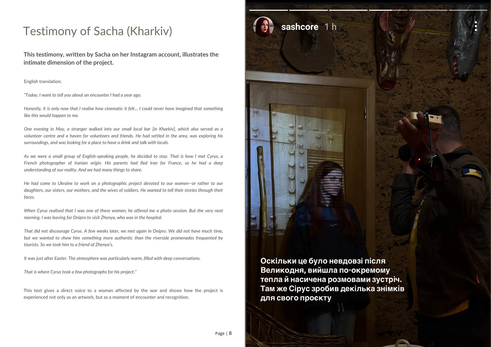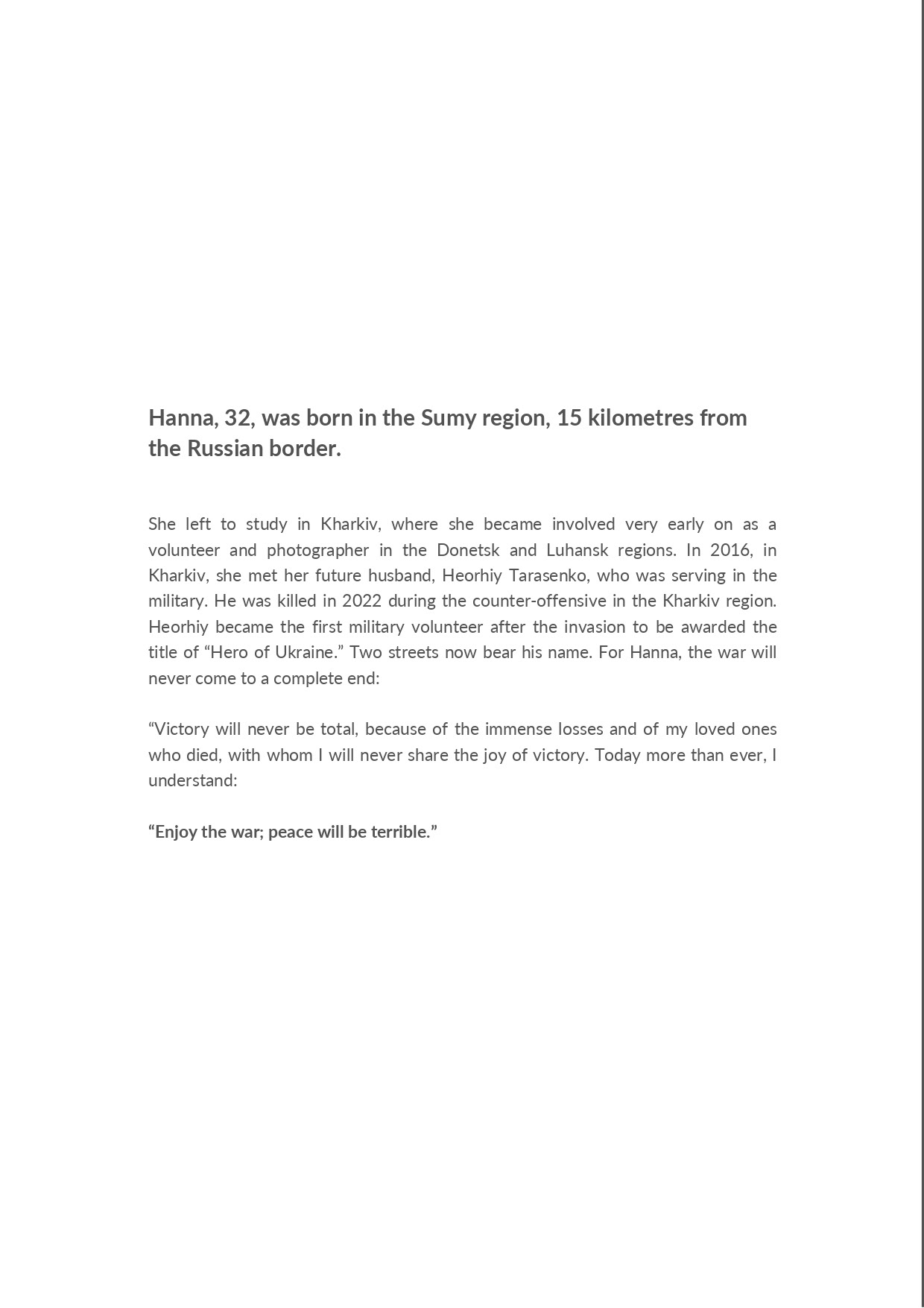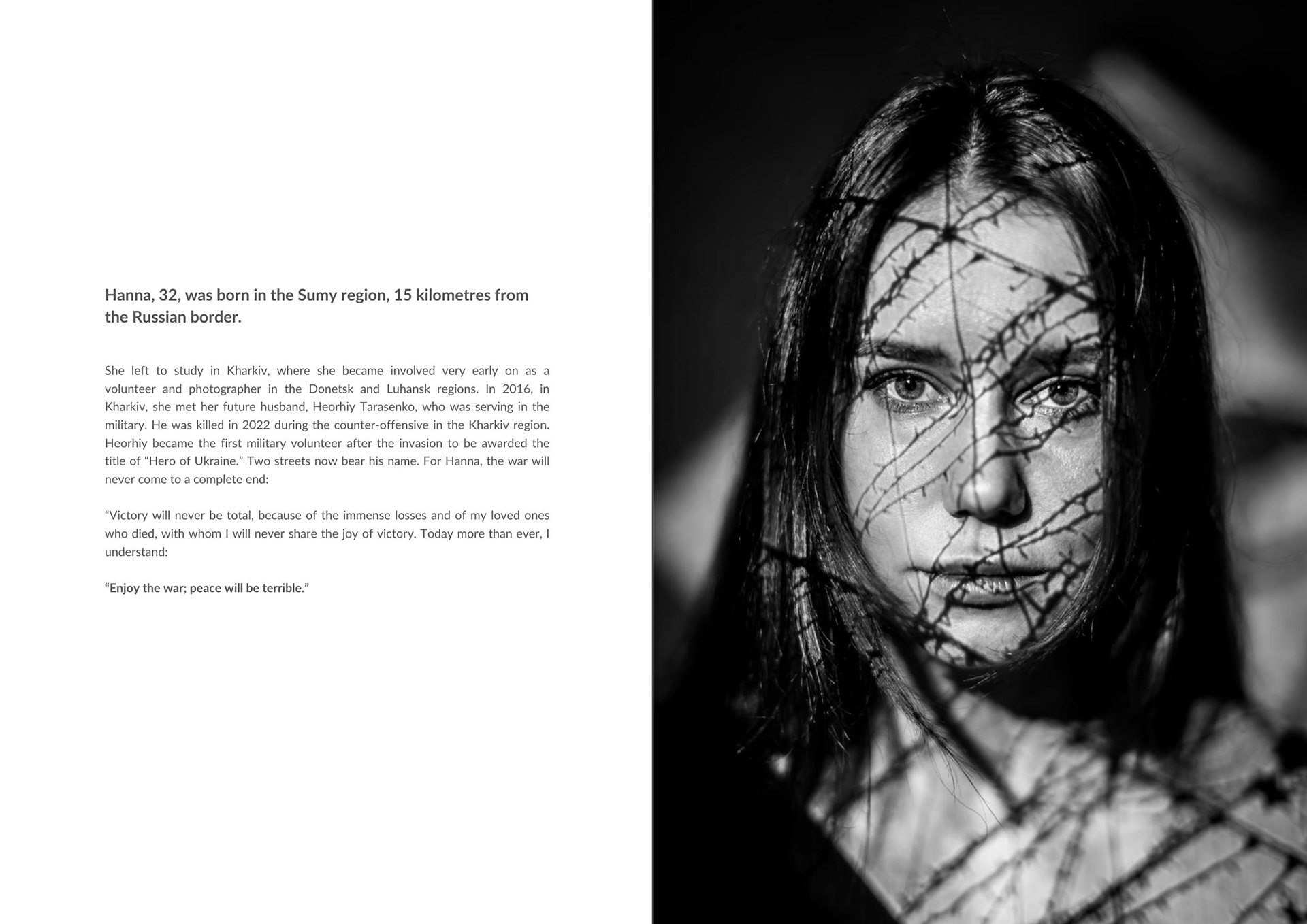 Hanna, 32, was born in the Sumy region (15 km from the Russian border), moved to Kharkiv for her studies and still lives there. She went to Donetsk and Luhansk to take photos and volunteer starting in 2014. In 2016, she met her future husband, Heorhiy Tarasenko, in Kharkiv. He died in 2022 during the counter-offensive in the Kharkiv region. He became the first military volunteer after the invasion to receive the title of 'Hero of Ukraine.' Two streets in Kharkiv now bear his name. Personally, victory in this war will never be complete because of the immense losses and the loved ones I will never share it with. Now more than ever, I understand the saying: 'Enjoy the war, the peace will be terrible.'