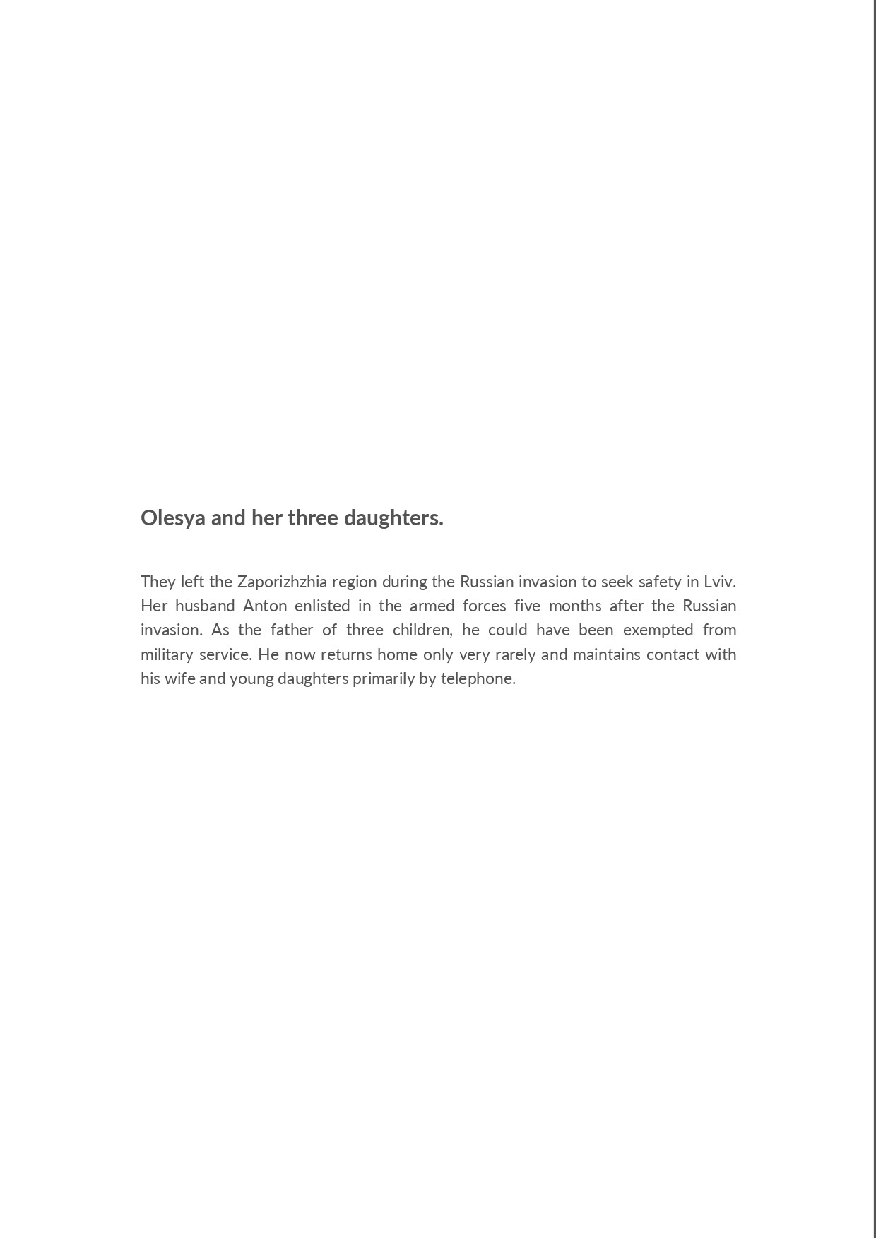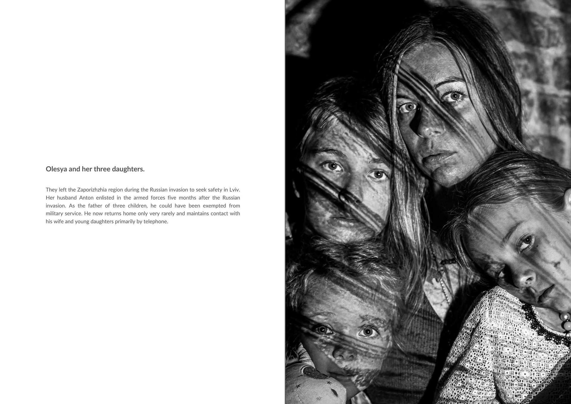 Olesya and her three daughters left the Zaporizhzhia region during the Russian invasion to take refuge in Lviv. Her husband Anton joined the army five months after the invasion. As a father of three, he could have avoided conscription. He rarely comes home and keeps in touch with his wife and daughters by phone.