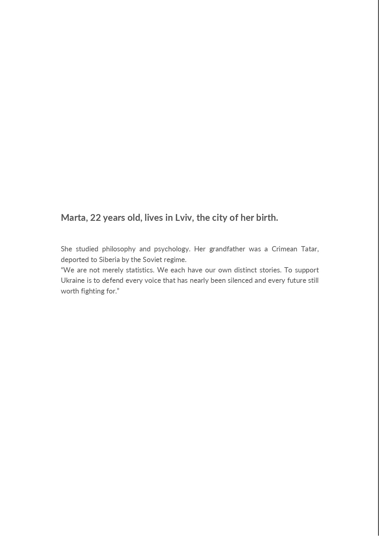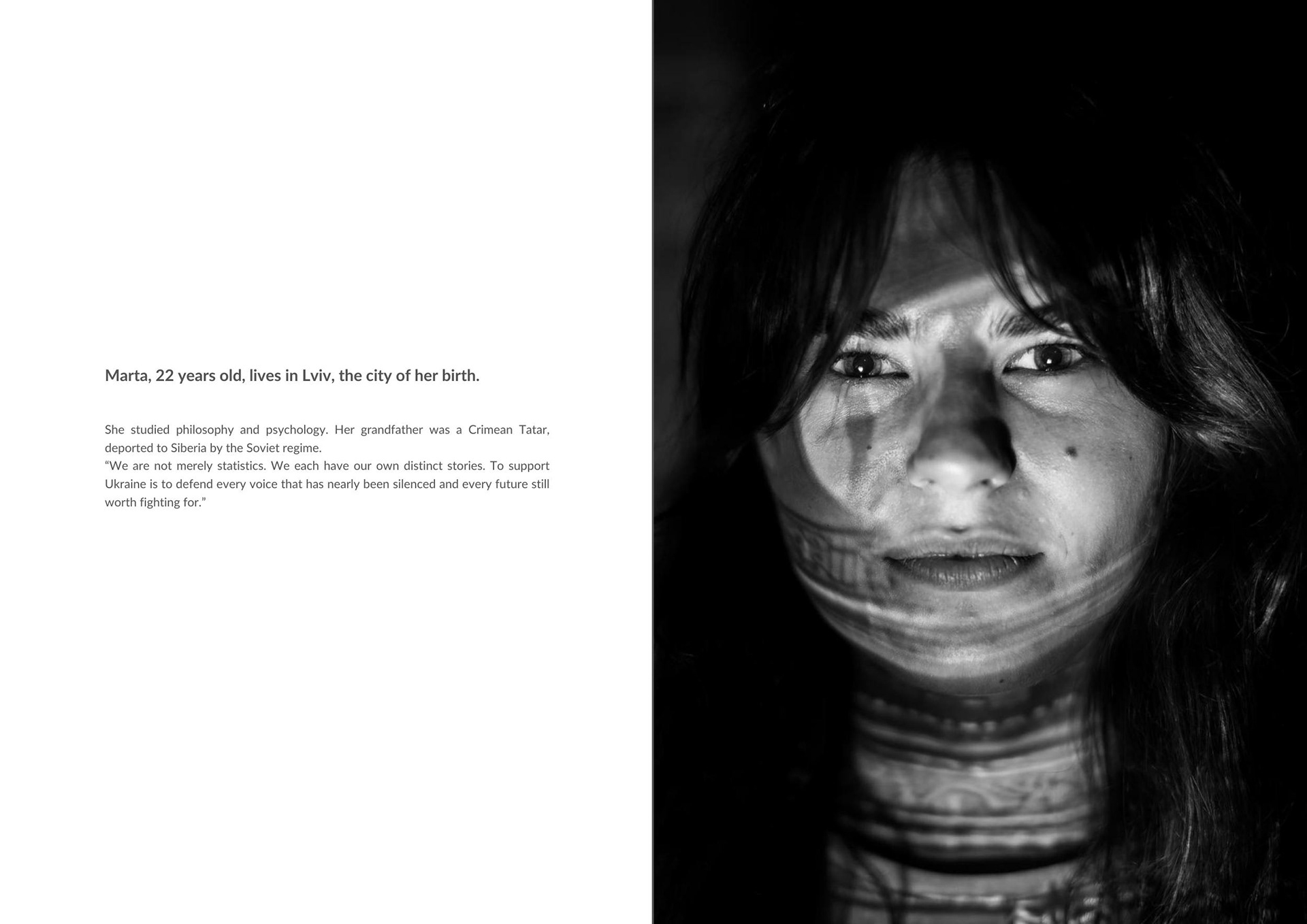 Marta, 22, lives in Lviv where she was born. She studied philosophy and psychology. Her grandfather was a Crimean Tatar deported by the Soviet regime to Siberia. We are not just statistics. We are all different stories. Supporting Ukraine means defending every voice that was almost silenced, and every future still worth fighting for.