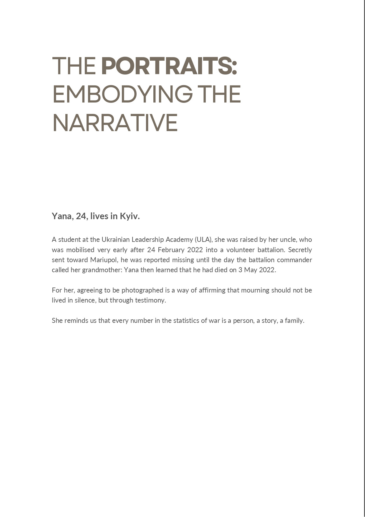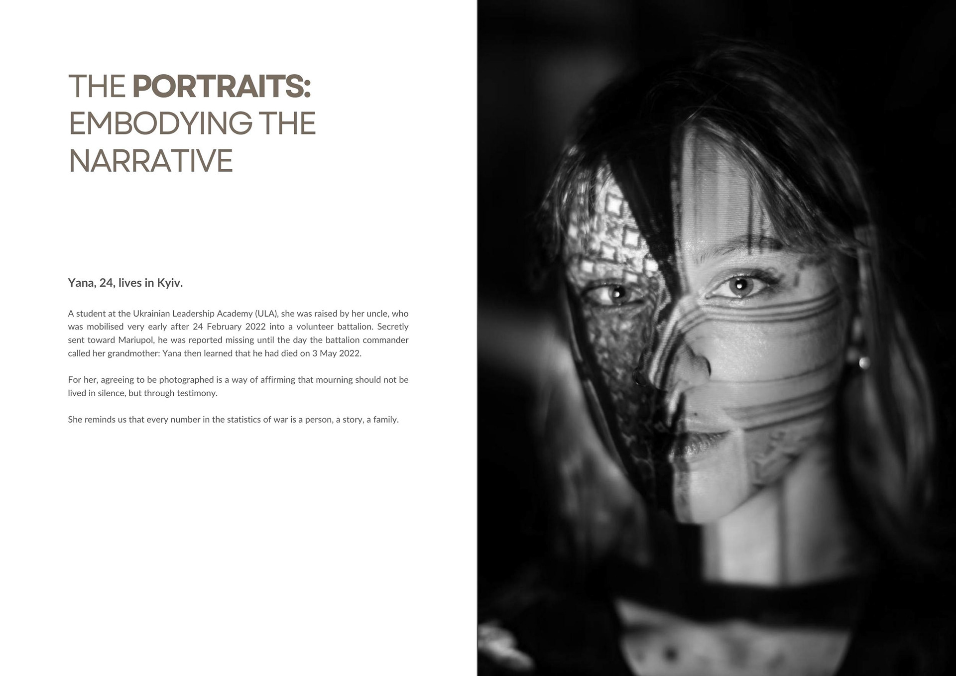 Yana, 24, lives in Kyiv and is a student at the Ukrainian Leadership Academy (ULA). Her uncle raised her and quickly joined a volunteer battalion after February 24, 2022. The battalion was secretly sent to Mariupol. The family had no information until the commander called Yana's grandmother to inform her that her uncle had died there on May 3, 2022. She now wants to work in the army. Everyone who has lost someone wants to scream their grief and show the world what's happening here. If we don't testify and fight, there's no hope for our future.