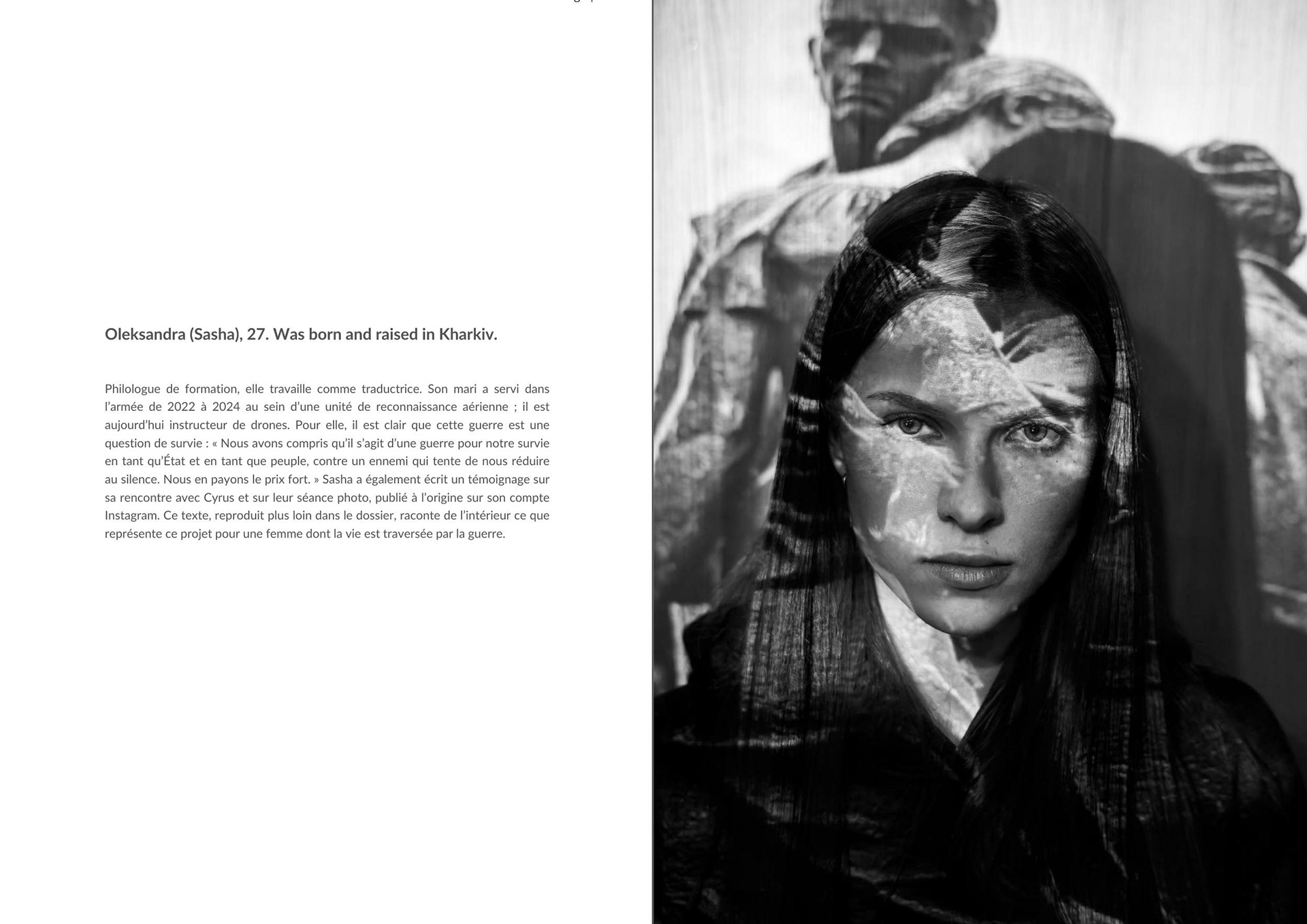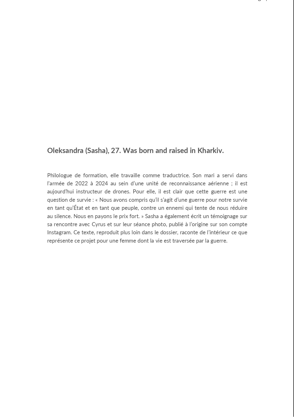 Oleksandra (Sasha), 27, was born and raised in Kharkiv, where she still lives. She is a philologist by training and worked for a long time as a translator. Her husband served in the army from 2022 to 2024 in aerial reconnaissance. He now works as a drone instructor.